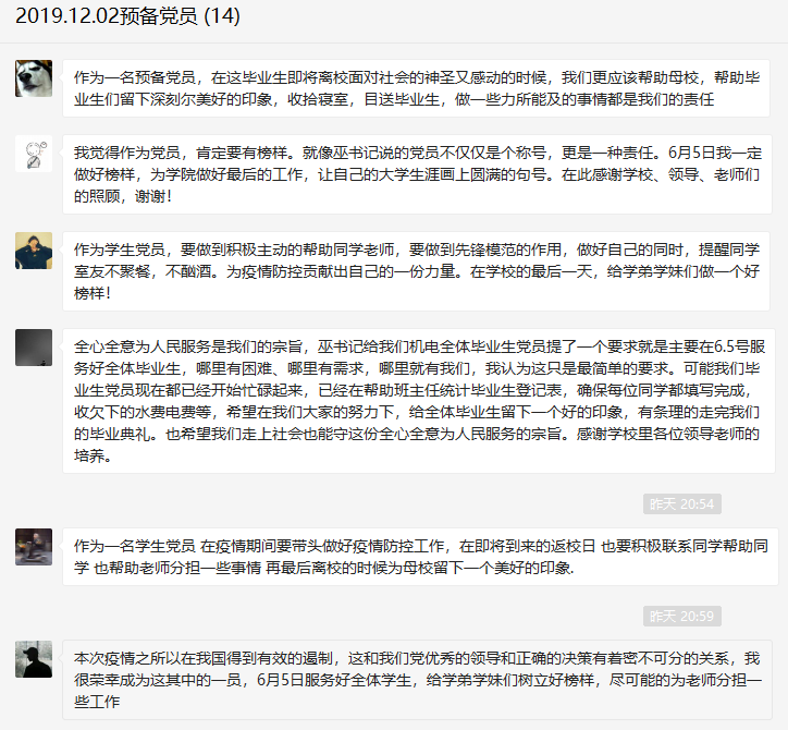 往年,毕业生返校之际,机电工程公司党总支会在毕业生党员离校前召开员工党员座谈会,做好毕业生党员思想教育工作和安全教育。今年,因为疫情影响,员工们返校时间短,任务重,留给大家坐在一起交流的时间很少。但党员的思想教育不能缺席,为了上好员工离校前最后一次党课,机电工程公司党总支创新形式,于2020年5月28日晚7点,组织全体毕业生党员,相约云上,举行了一场别开生面的线上座谈会。