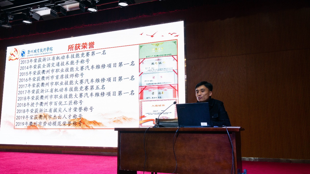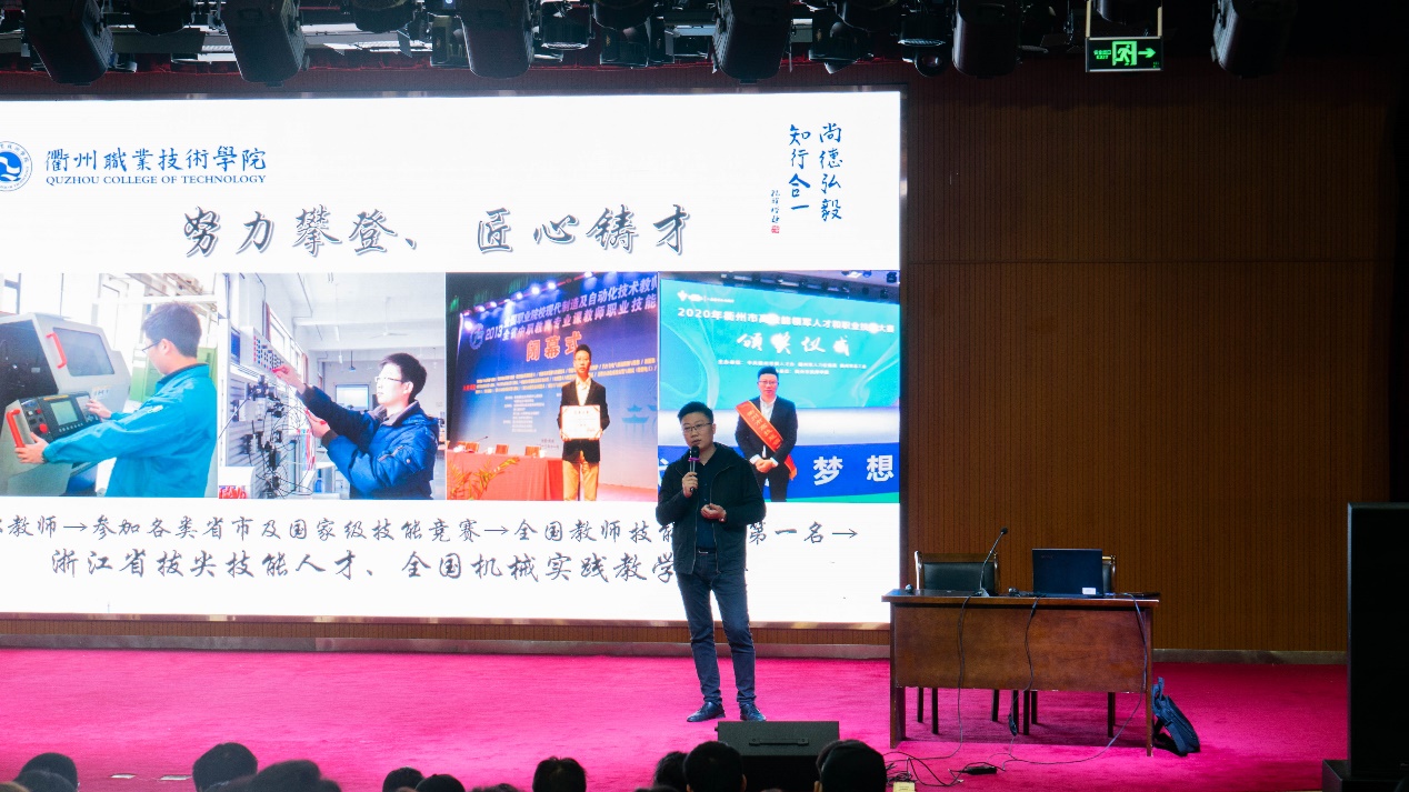 首先,毕少平老师分享了自己的成长故事。从中考失利,初入职场挨师傅骂,讲到经历了职业倦怠、转行以及创业失败,最后重操旧业,潜心钻研技能、提升学历、打磨技能水平,经历了赛场竞速,最终成为了一名教师。在这段经历中,毕老师从不给自己的人生设限,抓住一切机会努力奋斗,不断实现“弯道超车”。毕老师的成长经历,正诠释了“越努力越幸运”的道理。从自身经历出发,毕老师鼓励同学们“学好技能,要有梦想,努力拼搏”。演讲的最后,他鼓励道:“时间从来不能阻挡梦想的脚步,我们只要学会坚持,梦想就会每天壮大一点点。不轻易言弃,美好的事情终会到来!”