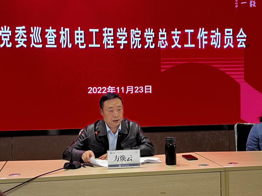 公司党委委员、纪委书记方焕云作巡查工作动员讲话。方焕云指出,党的二十大报告强调,全面从严治党是一项重大的政治工作和政治任务,开展校内巡查是全面从严治党向纵深发展的有效形式。方焕云强调,要理解把握巡查工作的内涵要求,切实支持配合做好巡查工作。一要提高政治站位,充分认识开展校内巡查工作对推动高质量发展、全面从严治党和深化改革创新的重要意义;二要全面贯彻巡查工作方针,把“两个维护”作为根本任务,围绕“立德树人”强化政治监督;三要强化政治担当,增强自觉接受监督的政治意识,机电工程公司要本着对党的事业高度负责的态度,积极支持配合巡查组,共同完成好本次巡查任务。