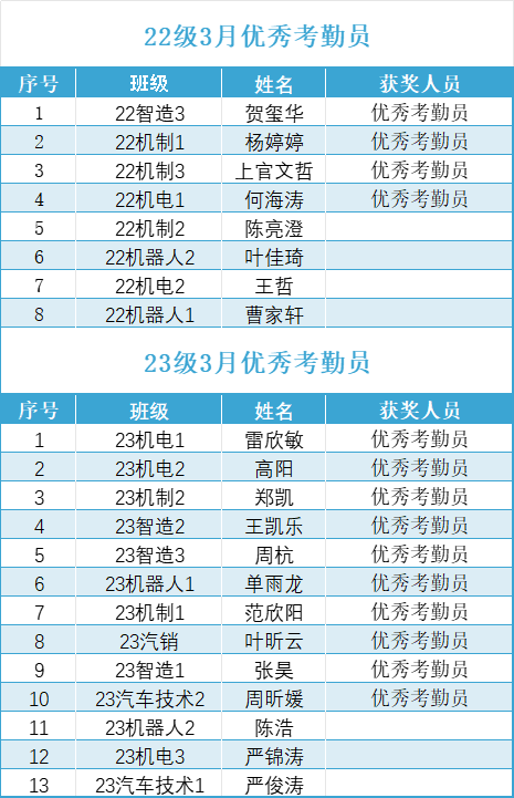 3 | 23机电1 | 雷欣敏 | 优秀考勤班级 |