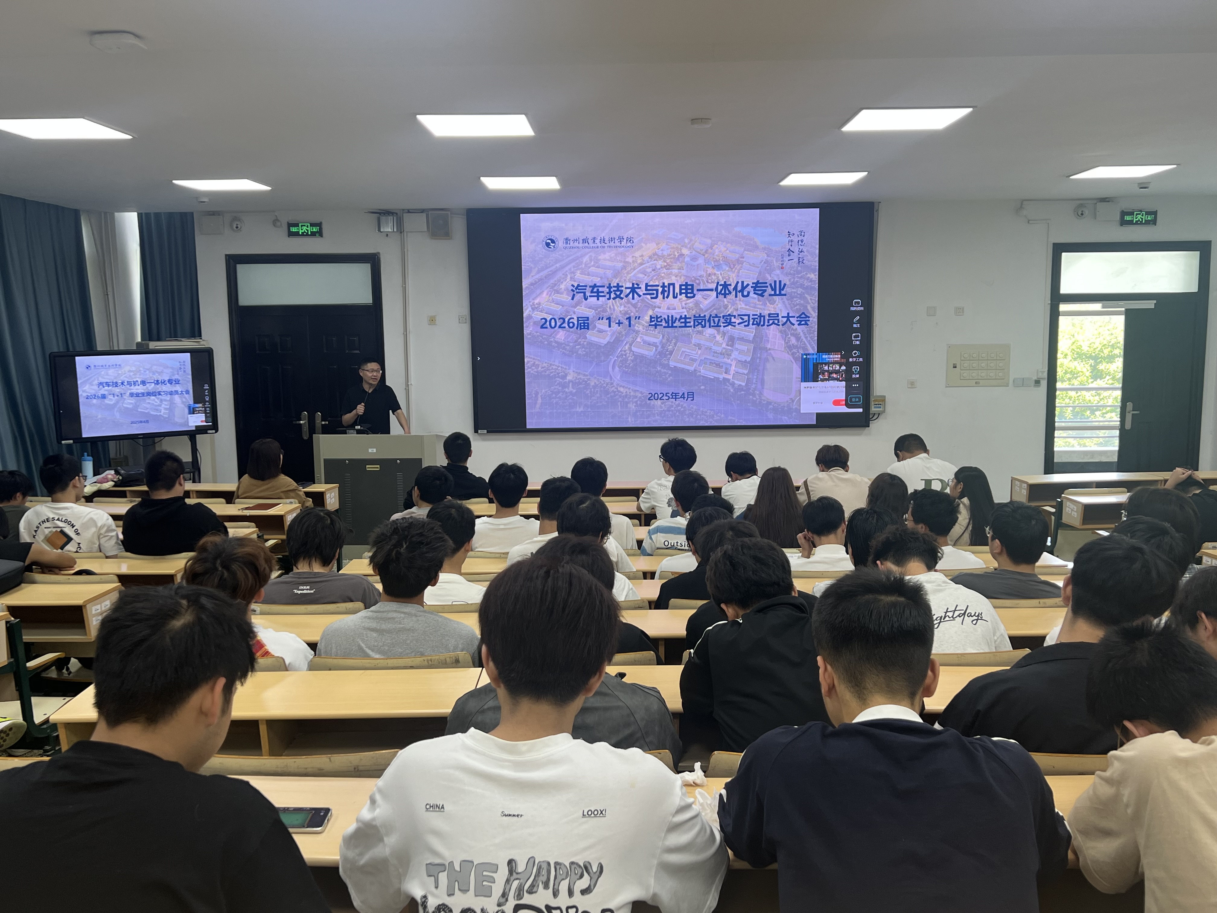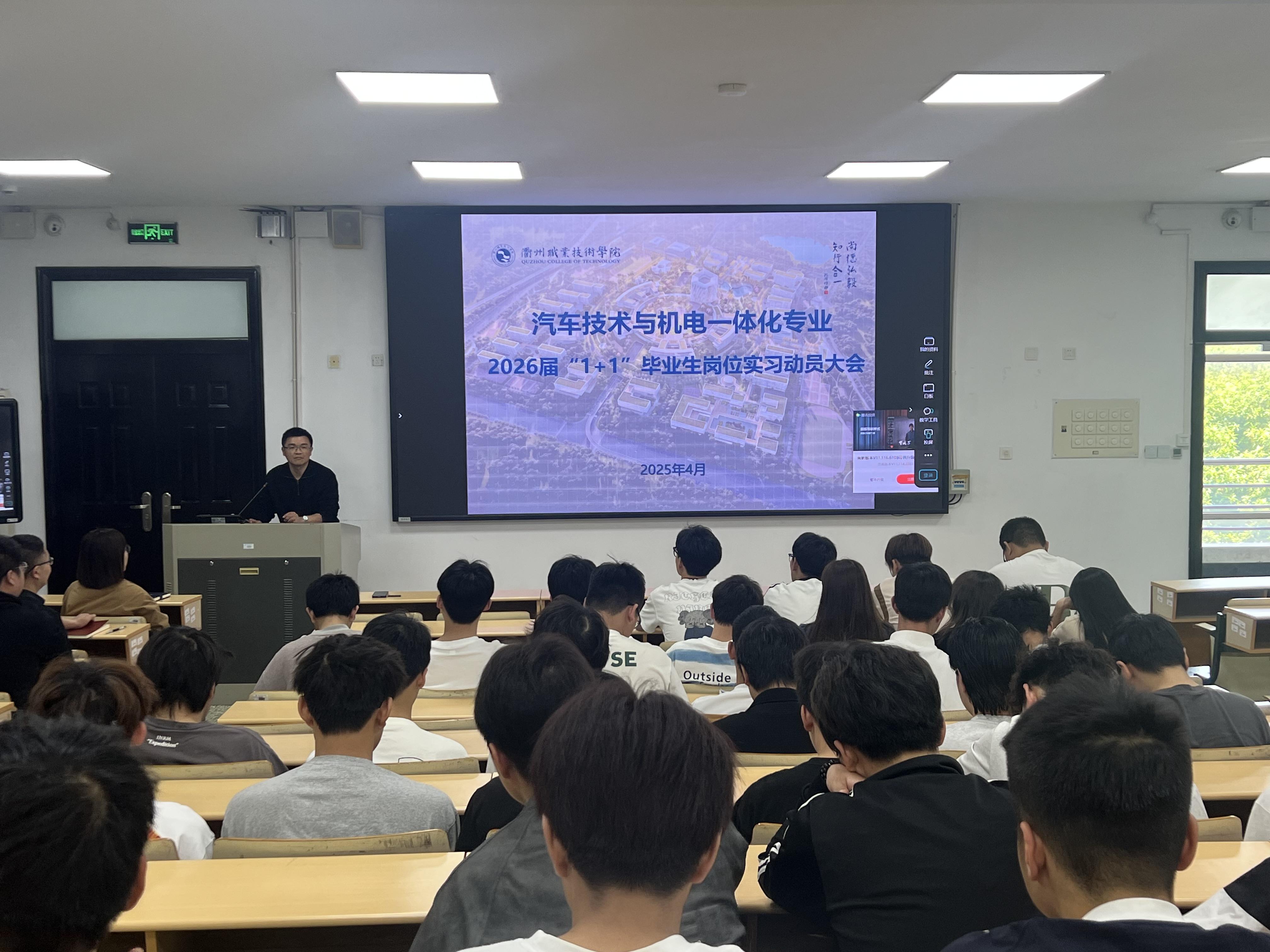 2025年4月19日中午12:15,太阳成tyc33455ccwww在阶西2-1教室举行了2026届汽车汽车制造与试验技术、机电一体化技术专业的实习动员大会。此次大会旨在为同学们即将开始的实习做好充分准备。