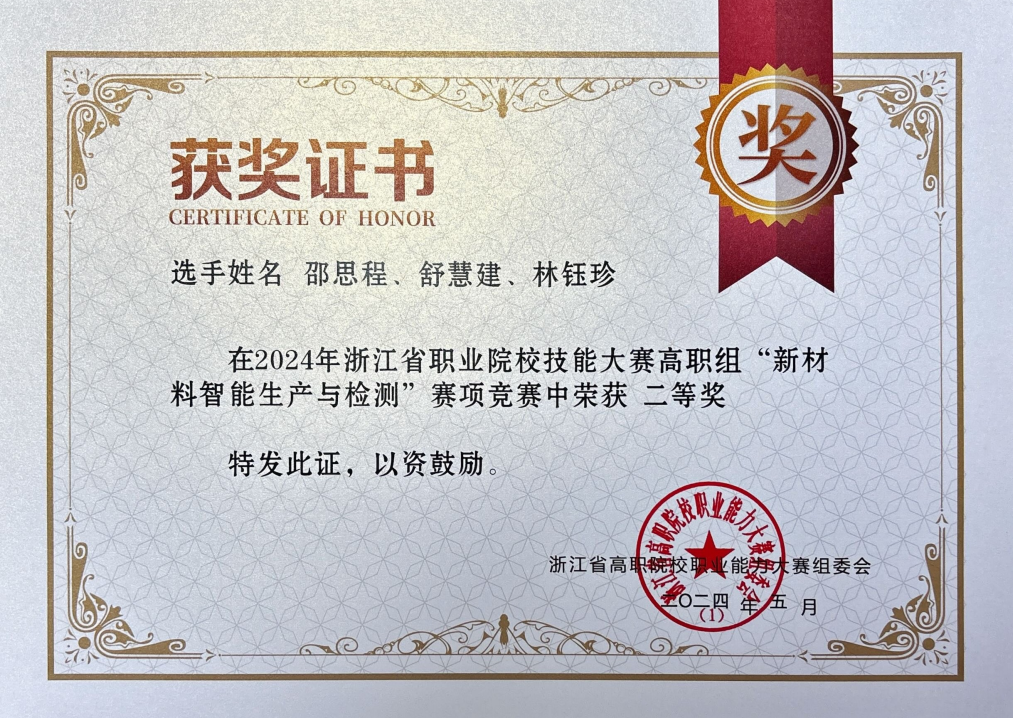 近日,2024年浙江省职业院校技能大赛中捷报频传,支部师生在多个赛道表现优异,收获一等奖1项、二等奖1项、三等奖2项的好成绩! 支部党员教师汪文娟、徐建亮指导,22机制专业员工丁伟良、吴剑、金天参与的赛项“新材料智能生产与检测”获一等奖,机制专业员工马煌畯、叶维旺以及张建伟、吴易烜参加该赛项收获二等奖2项,支部党员教师舒慧建、林钰珍参与该赛项获教师团体二等。