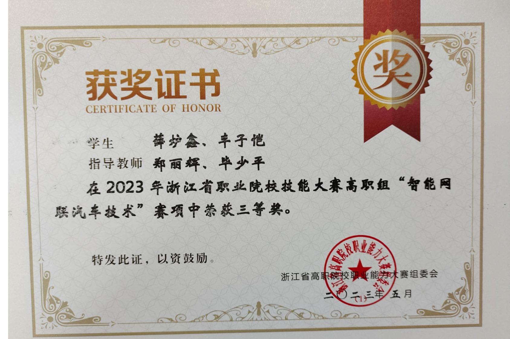郑丽辉、毕少平指导员工获2023年浙江省职业技能智能网联三等奖